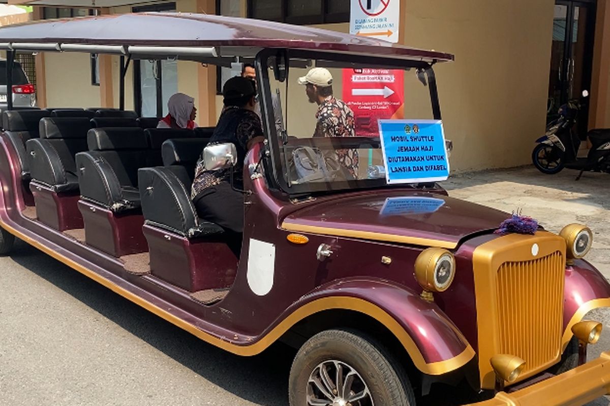 "Mobil shuttle jemaah haji, diutamakan untuk lansia dan difabel," tulis kertas yang dipasang di kaca depan kendaraan tersebut.