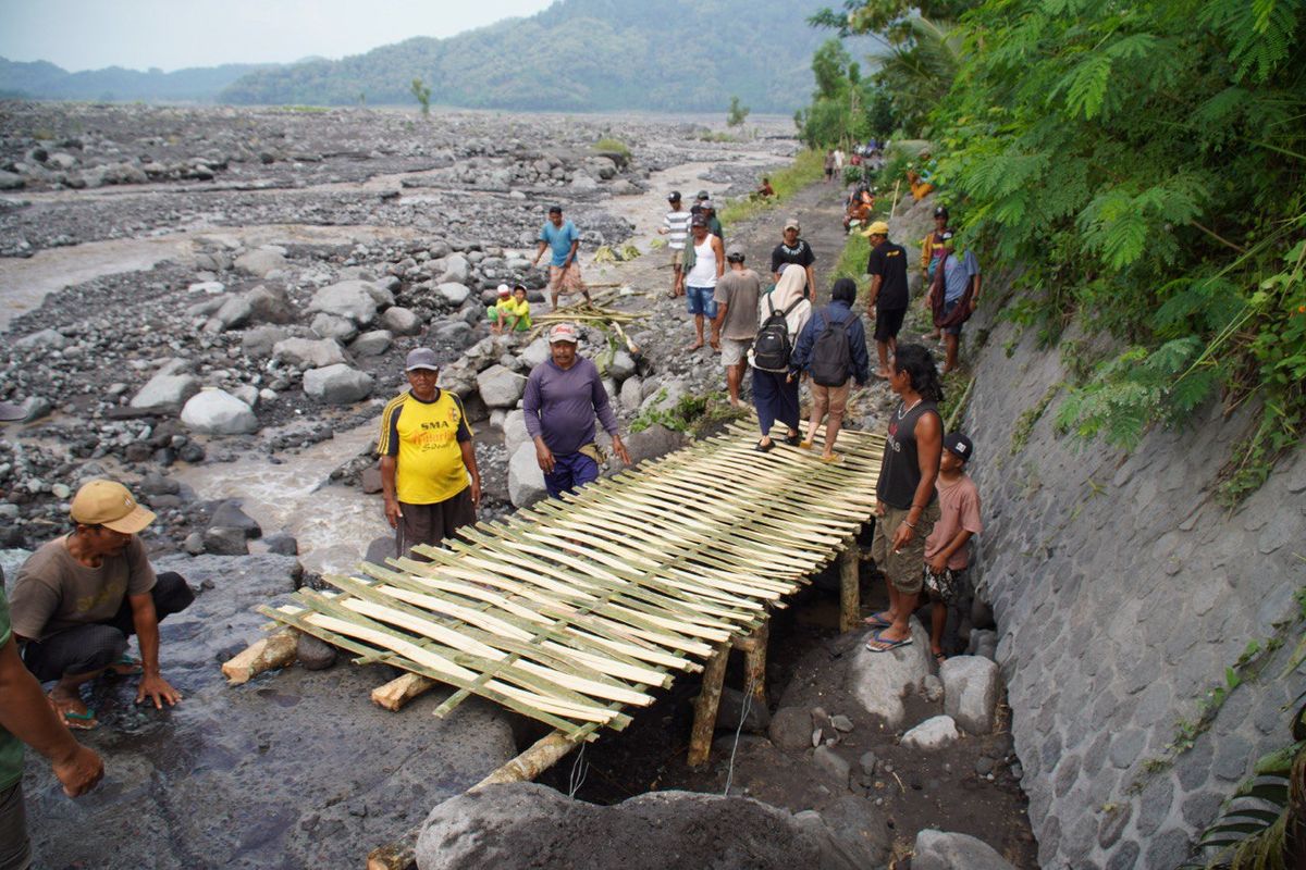 Tanpa jembatan darurat ini, warga yang ingin melintas ke seberang sungai harus turun ke dasar sungai dan memanjat batu untuk mencapai jembatan limpas.