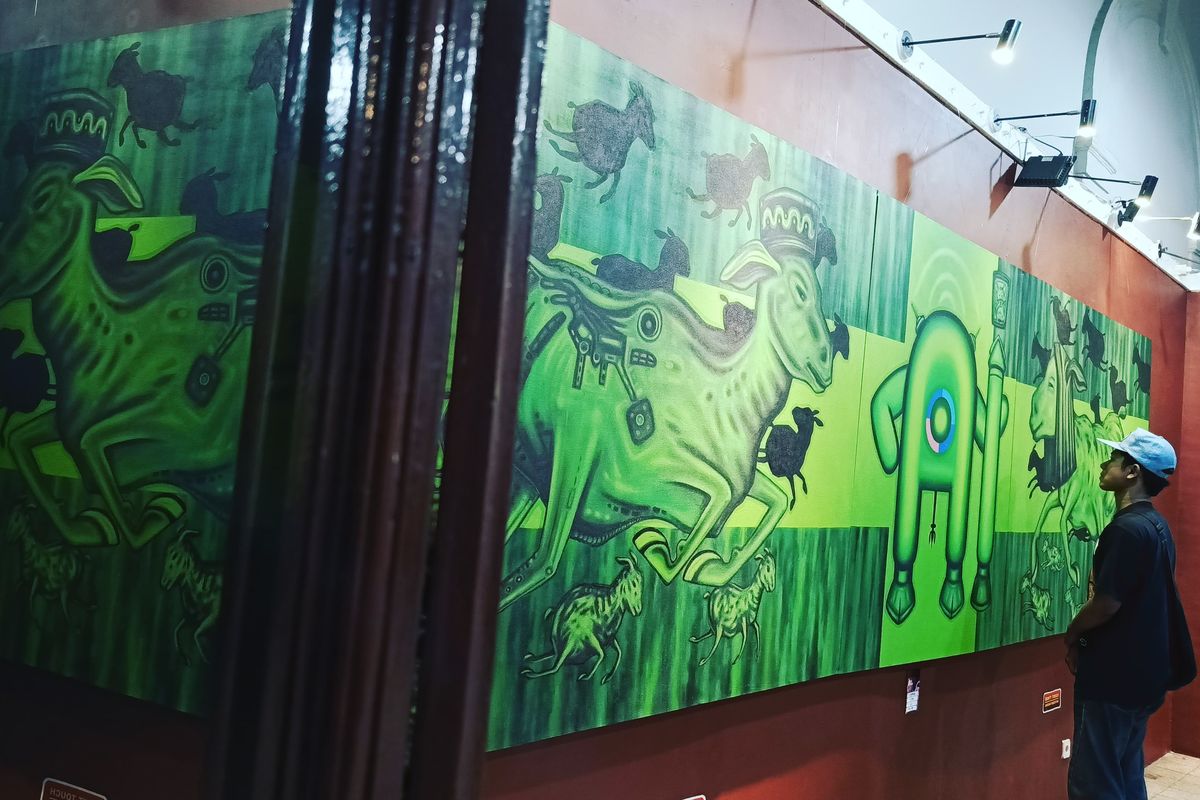 "Lukisan ini bercerita soal pergeseran masyarakat ke dunia digital. Saya gabungkan unsur logo Meta dan Android dengan gambar kambing di sisi kanan dan kiri, sebagai simbol pergeseran budaya," tuturnya.