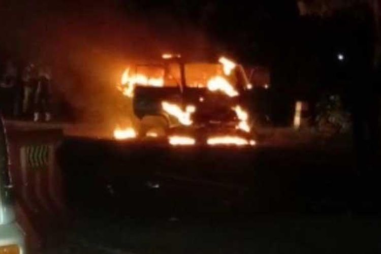 Tangkapan layar mobil terbakar di depan Exit Tol Dumpil, Kecamatan/Kabupaten Madiun, Selasa (28/12/2021).