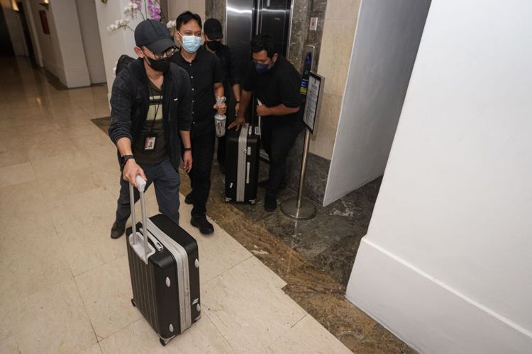 Penyidik dari Komisi Pemberantasan Korupsi (KPK) membawa koper usai melakukan penggeledahan di Kantor Gubernur Jawa Timur, Surabaya, Jawa Timur, Rabu (21/12/2022). KPK melakukan penggeledahan di Kantor Gubernur Jawa Timur pascapenangkapan Wakil Ketua DPRD Jawa Timur 2019-2024 Sahat Tua Simanjuntak dalam kasus dugaan tindak pidana korupsi berupa suap pengelolaan dana hibah Provinsi Jawa Timur. ANTARA FOTO/Rizal Hanafi/YU (ANTARA FOTO/Rizal Hanafi)