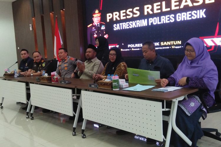 Rilis di kantor Polres Gresik, Jawa Timur, terkait siswi SD yang mata kanannya mengalami penurunan pengelihatan, Kamis (21/9/2023).