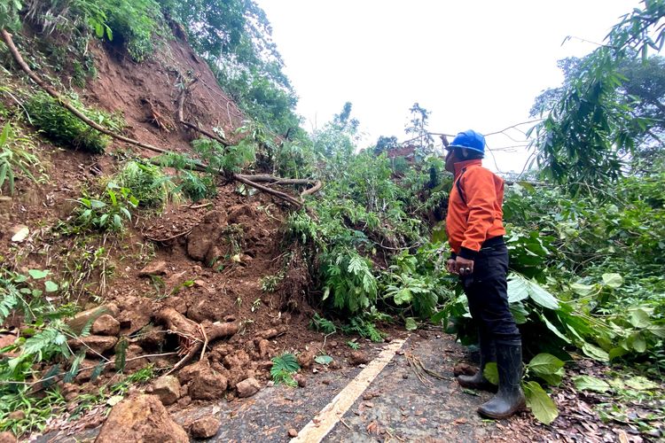 Akses jalan alternatif antar kabupaten Madiun-Ponorogo terputus akibat tertimbun tanah longsor setinggi delapan meter tepatnya di Dusun Kandangan, Desa Kare, Kecamatan Kare, Kabupaten Madiun, Jawa Timur, (31/1/2025).(KOMPAS.com/Dokumentasi BPBD Madiun)