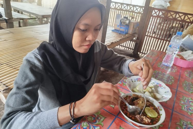 Salah satu pengunjung saat menikmati Soto Mata Sapi Bu Mis di Bangkalan, Senin (21/4/2025)