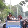 Sepanjang jalan, tampak warga berjajar sambil mengibarkan bendera merah putih dan meneriakkan nama putra asli Pronojiwo itu.