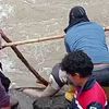 Korban yang tenggelam, diselamatkan oleh seorang perenang dewasa lalu diangkat ke tepi kolam.
