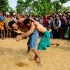 Kegiatan gulat okol dilaksanan di atas tumpukan jerami.