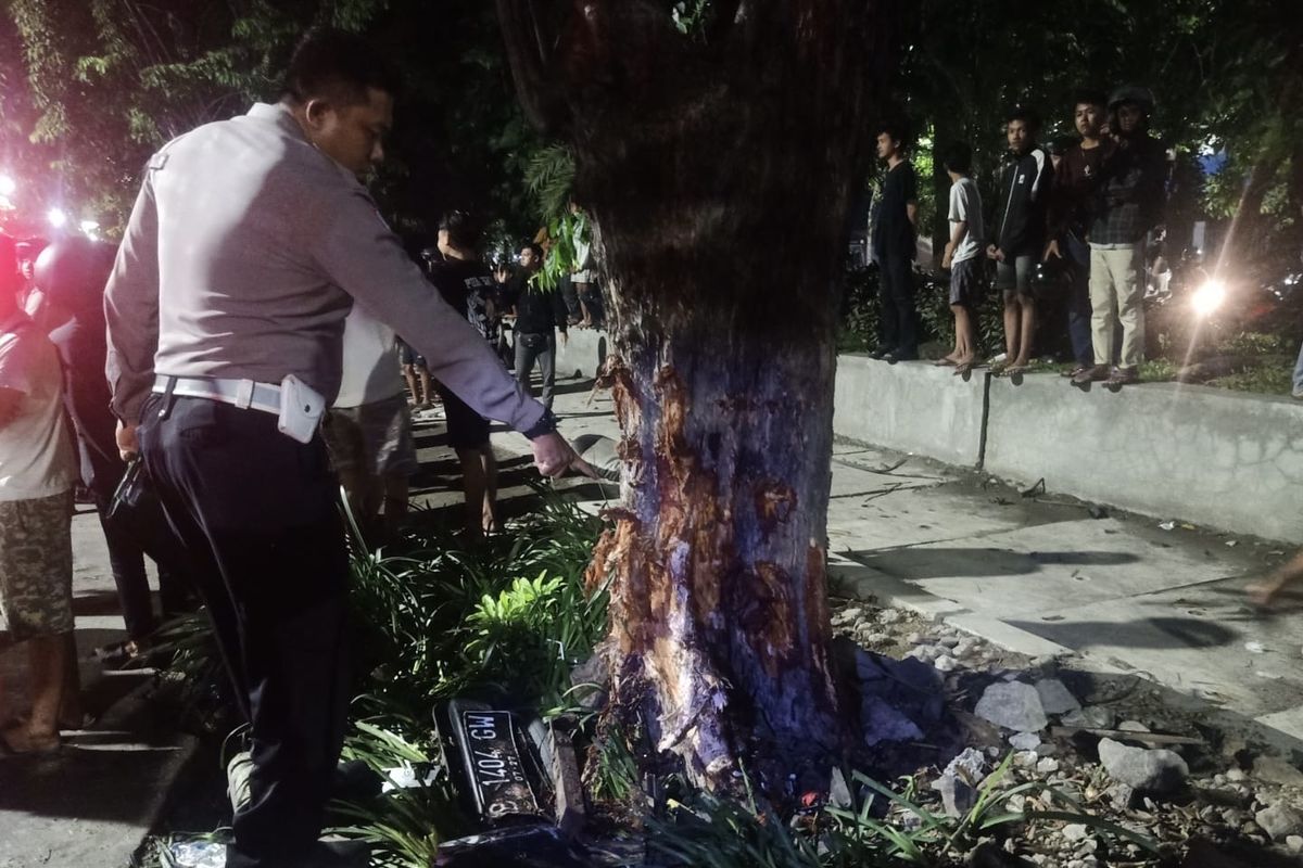 Setelah menabrak gerobak sampah, mobil Ford tersebut kembali kehilangan kendali dan menabrak pohon di tepi jalan.