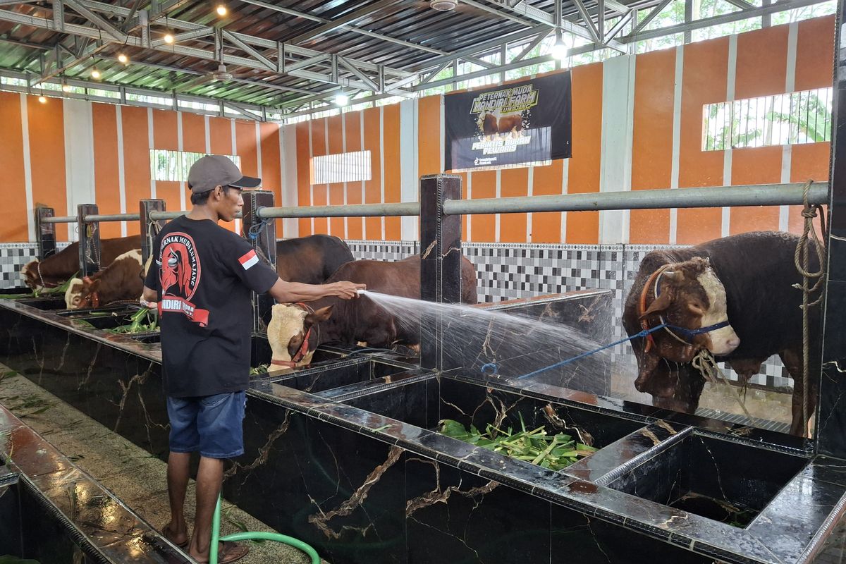 Sapi-sapi jumbo ini dimandikan tiga kali sehari, sebuah praktik yang krusial untuk menjaga kebersihan kulit dan kenyamanan sapi.