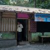 Di gerbang pembatas masuk proyek perbaikan, dua orang pesepeda tengah beristirahat dan membeli sarapan di warung dekat pos.